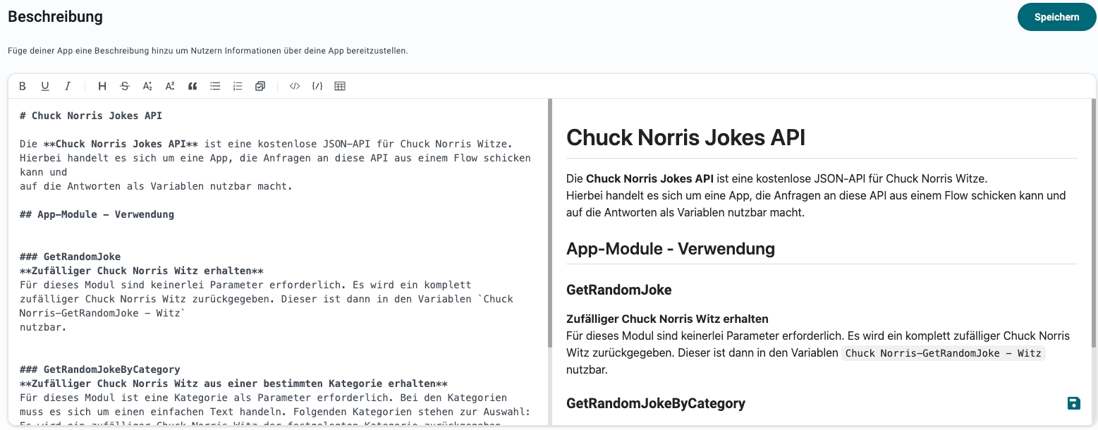 In der Beschreibung ist es möglich, Informationen zu der App und der Module in Form von Markdown zu verfassen. Diese Art der Dokumentation bezüglich der App ermöglicht es den Nutzern eines Chatbots die App und deren Module zu verstehen und vereinfacht folglich die Verwendung.