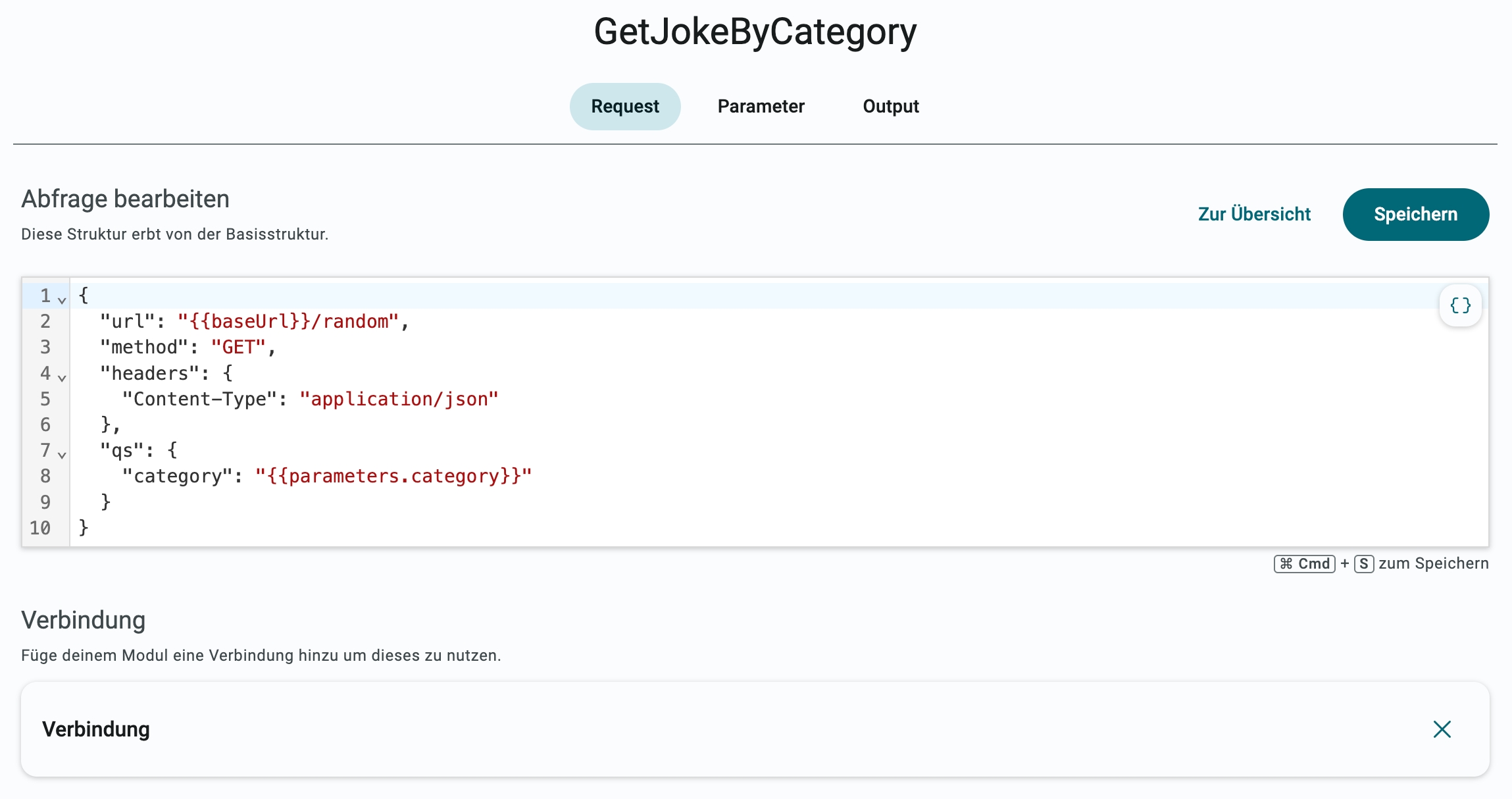Es wird ein Witz mit der Kategorie ("category") und dem Witzetext ("value") aus dem Body erstellt. Es müssen dementsprechend im Teil Festlegen der Parameter diese Parameter angelegt werden.