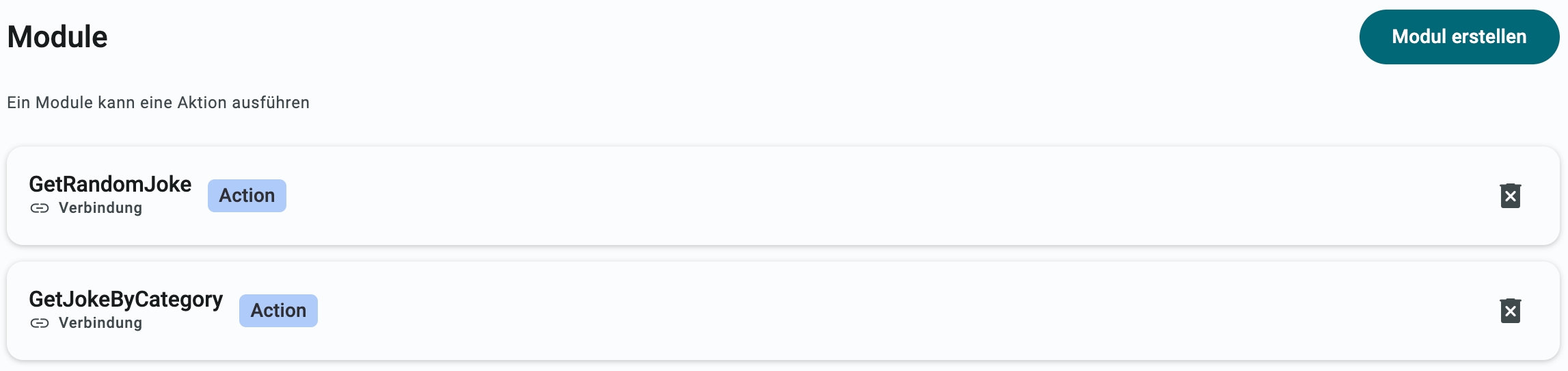 Module können Aktionen bzw. Anfragen im Flow ausführen. Diese Module sind als Schritte im Bot Builder vorhanden und können dort verwendet werden.