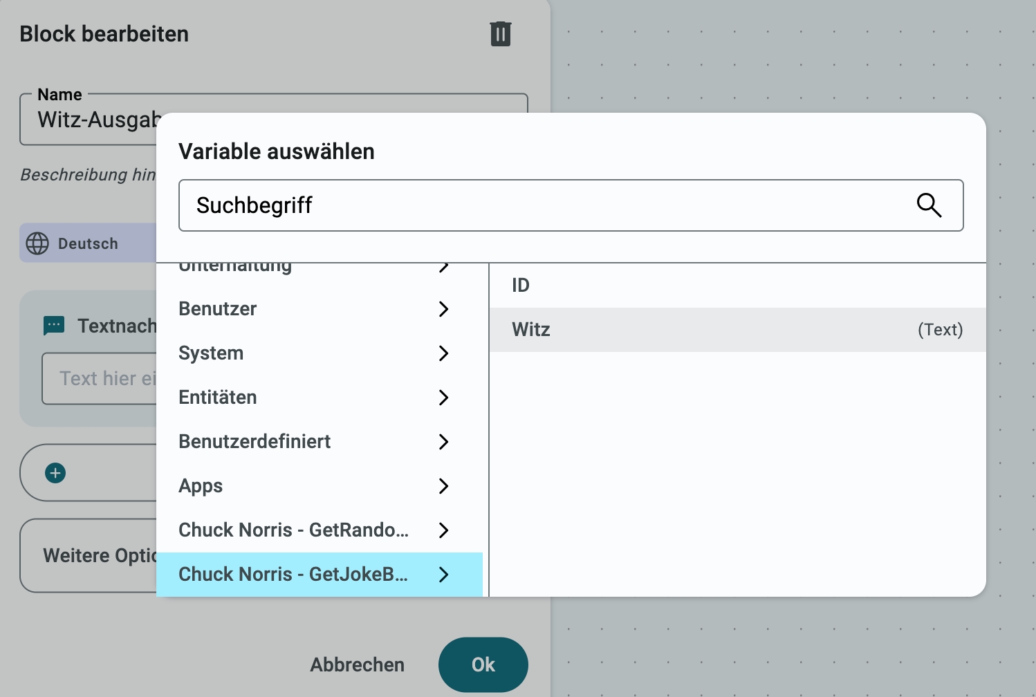 Nachdem ein Modul im Flow durchlaufen wurde, werden die Rückgabewerte in den Variablen der entsprechenden App gespeichert. Von dort aus kann man auf die Daten/Werte zugreifen und diese im Flow weiterverarbeiten.