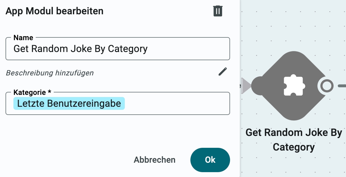 Ein App wird wie ein normaler Step in den Flow integriert und dort ausgeführt auch ausgeführt. Zunächst muss das App-Modul (falls notwendig) mit den benötigten Parameter gefüllt werden und anschließend kann über den Output (bzw. die App-Modul Variablen) die Rückgabe weiterverarbeitet werden.